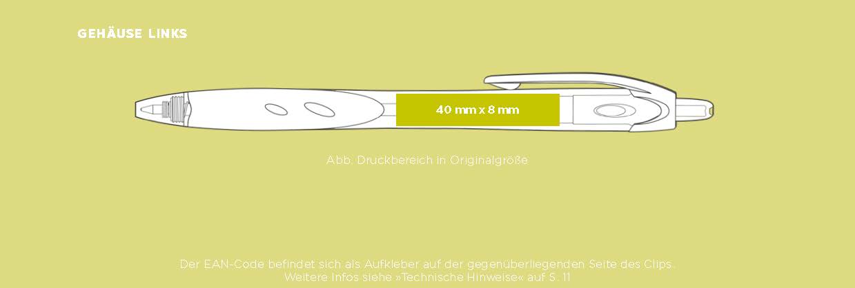 Das Gehäuse ist farblich auf die jeweilige Schreibfarbe abgestimmt, während der Taschenclip in neutralem Weiß gehalten ist.