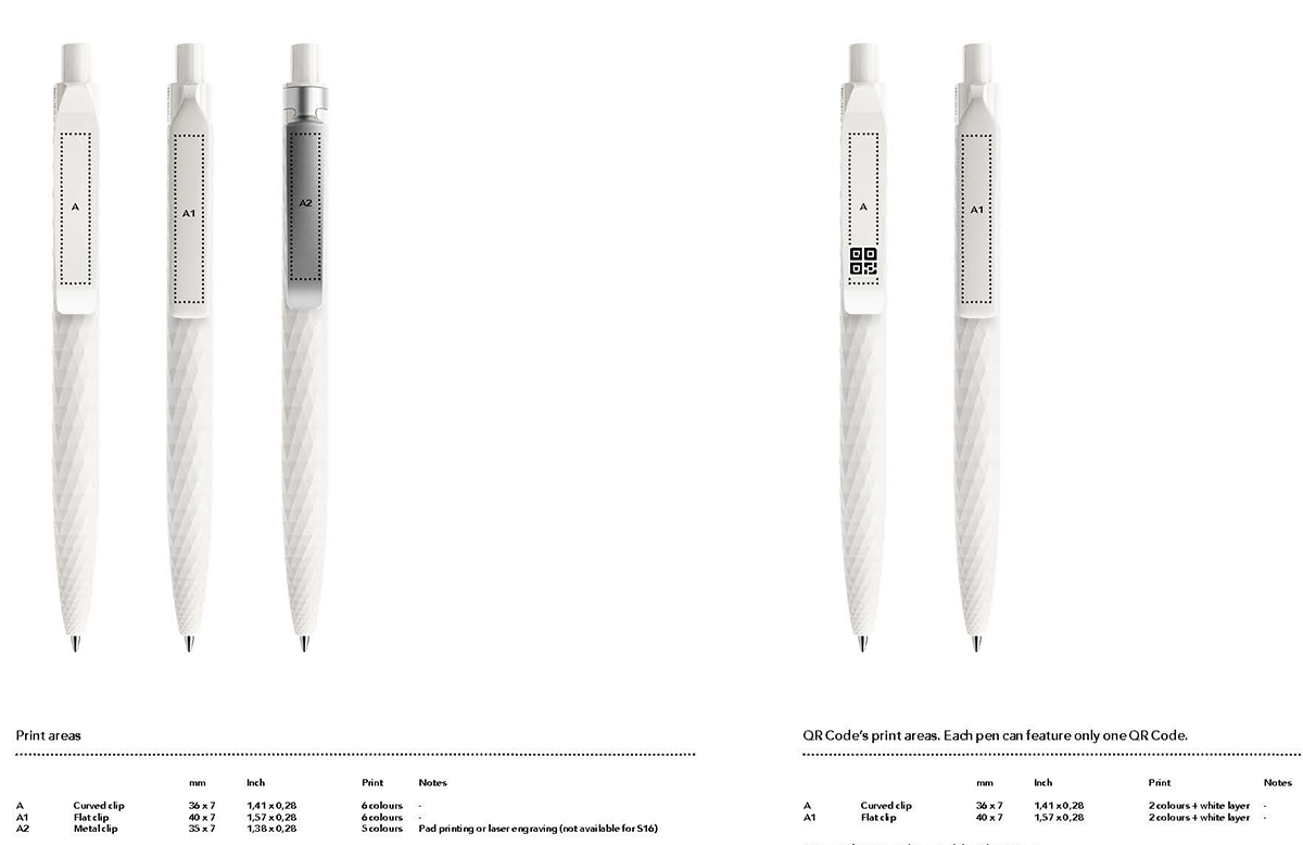 Wertige Personalisierungsmöglichkeiten wie Clips in verschiedenen Formen, Materialien und Finishs, farblich abgesetzte Clip-Holder für Metall-Clips, edle Metall-Druckknöpfe, antimikrobielle Oberflächenbehandlung sowie schadstoffarme Schreibsysteme machen den QS01 zu einem vielseitigen, ausdrucksstarken Markenbotschafter.