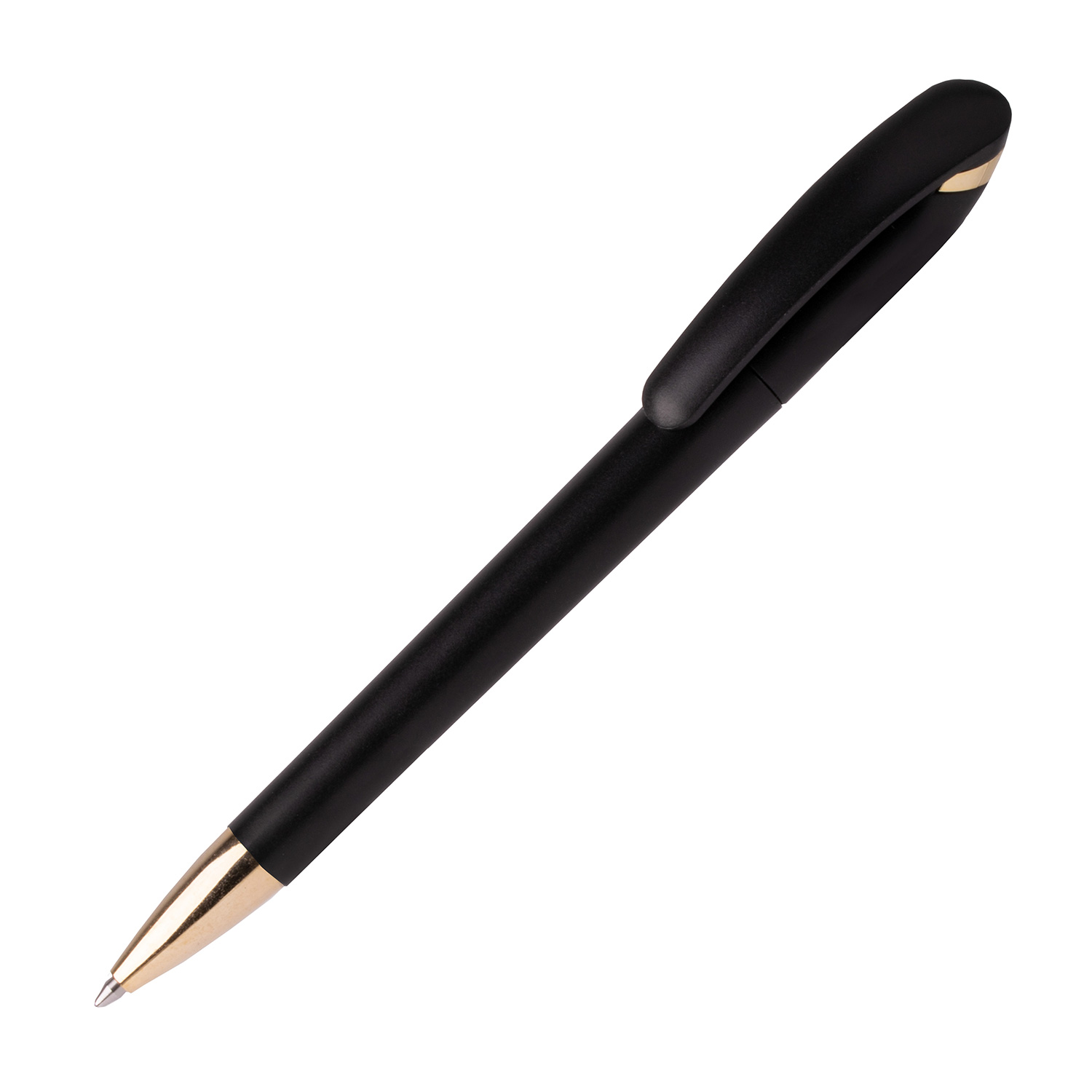 Drehkugelschreiber, Schaft und Clipteil in schwarz gedeckt, Oberfläche matt, Applikation in Gold-Optik,