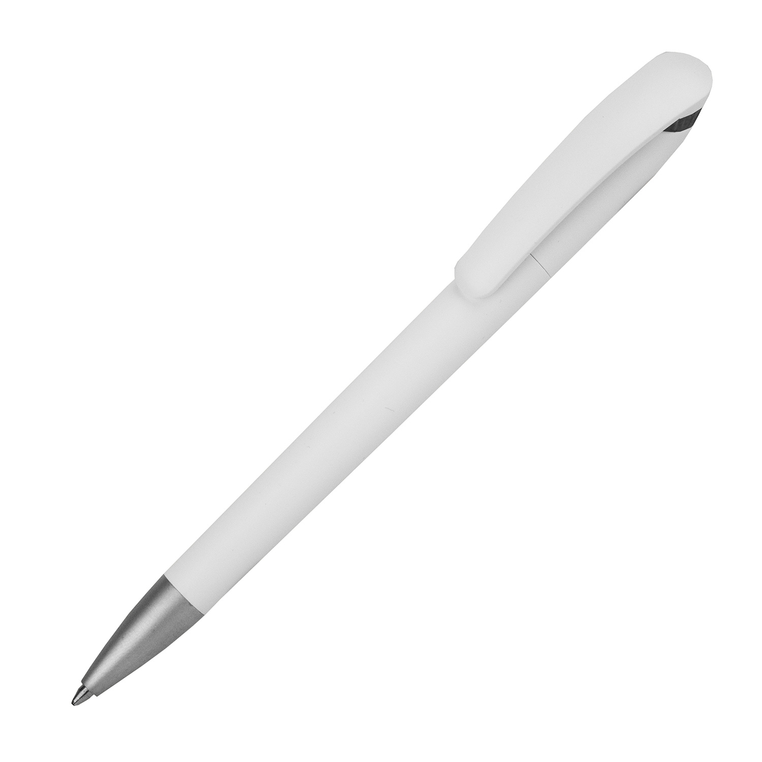 Drehkugelschreiber, Schaft und Clip in weiss, Oberfläche matt, satinierte Metallspitze.