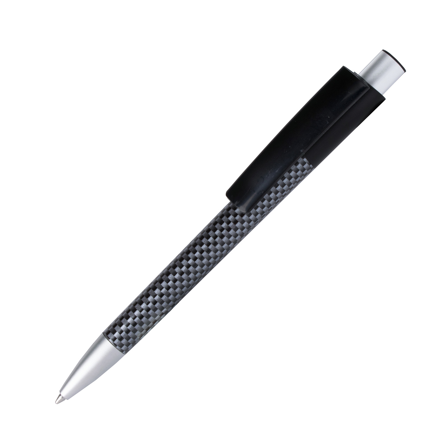 Druckkugelschreiber, Schaft in Carbon Look, Clip und Applikationen in Vollfarbe Schwarz,