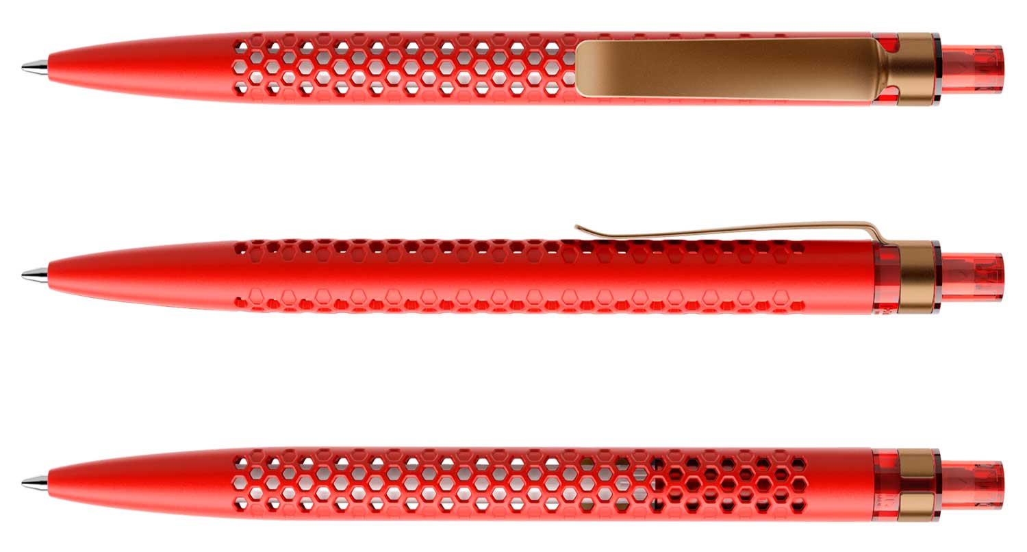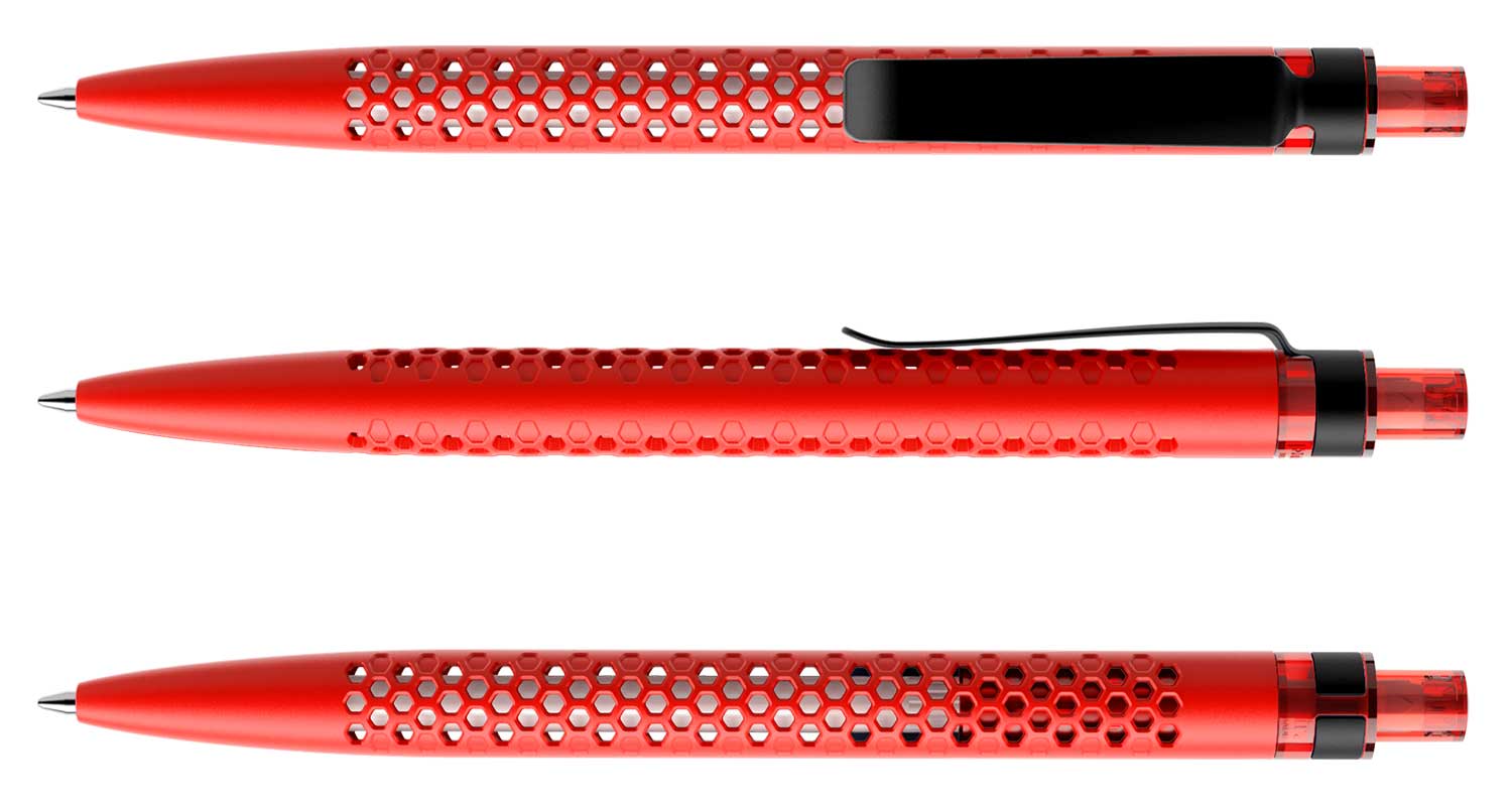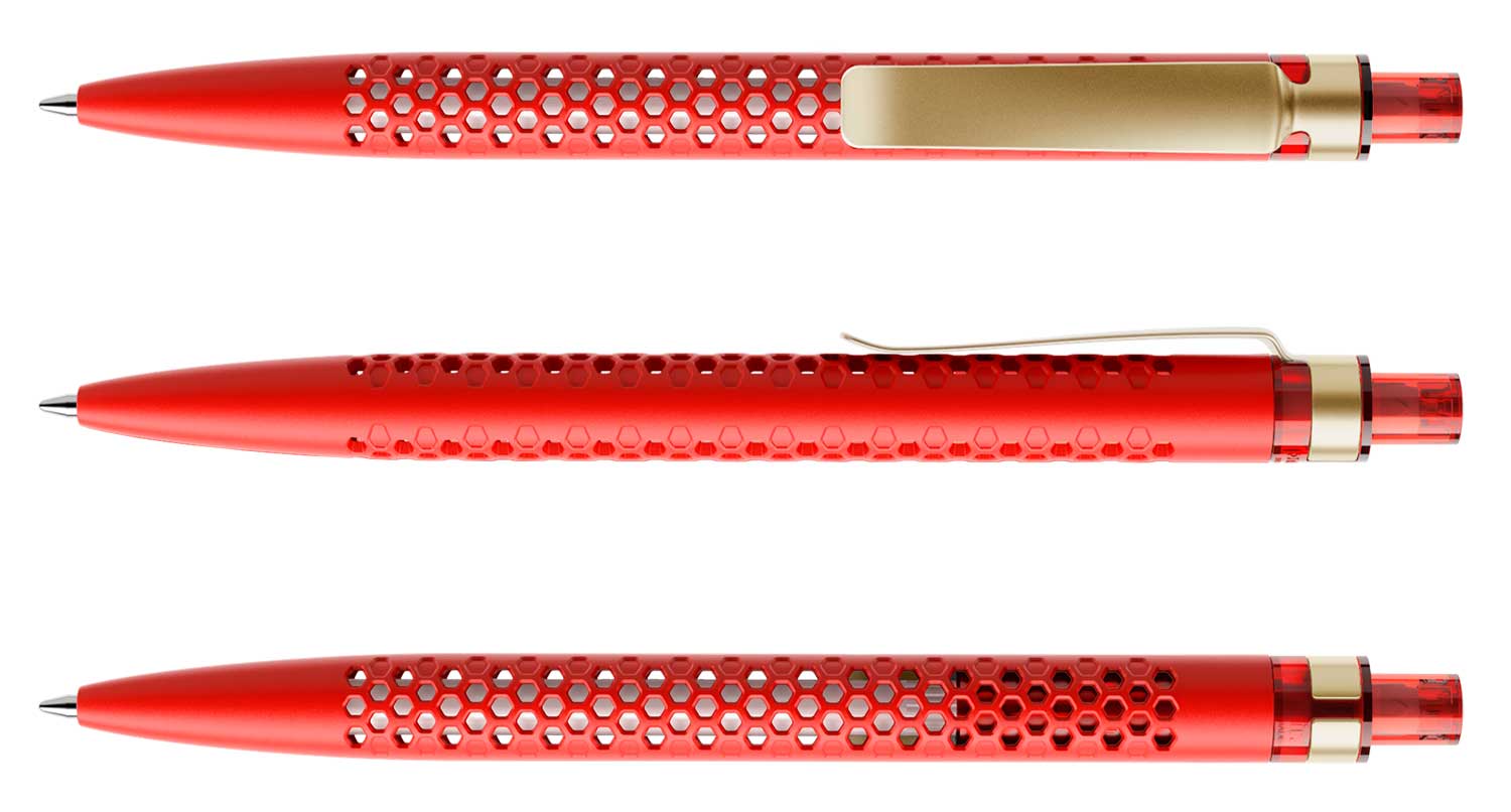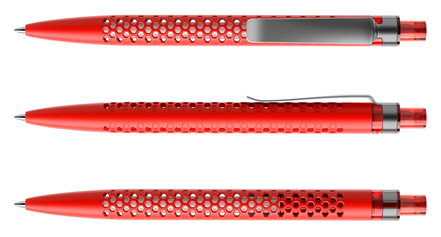 Das symmetrische Lochmuster schafft Transparenz, und die Mine im Innern des Schreibgeräts ist sichtbar. Dadurch gewinnt das Gehäuse eine dreidimensionale Tiefe. Die Minen, in Weiss, Schwarz oder Metall, werden Teil der Aussenwahrnehmung, setzen feine Akzente.