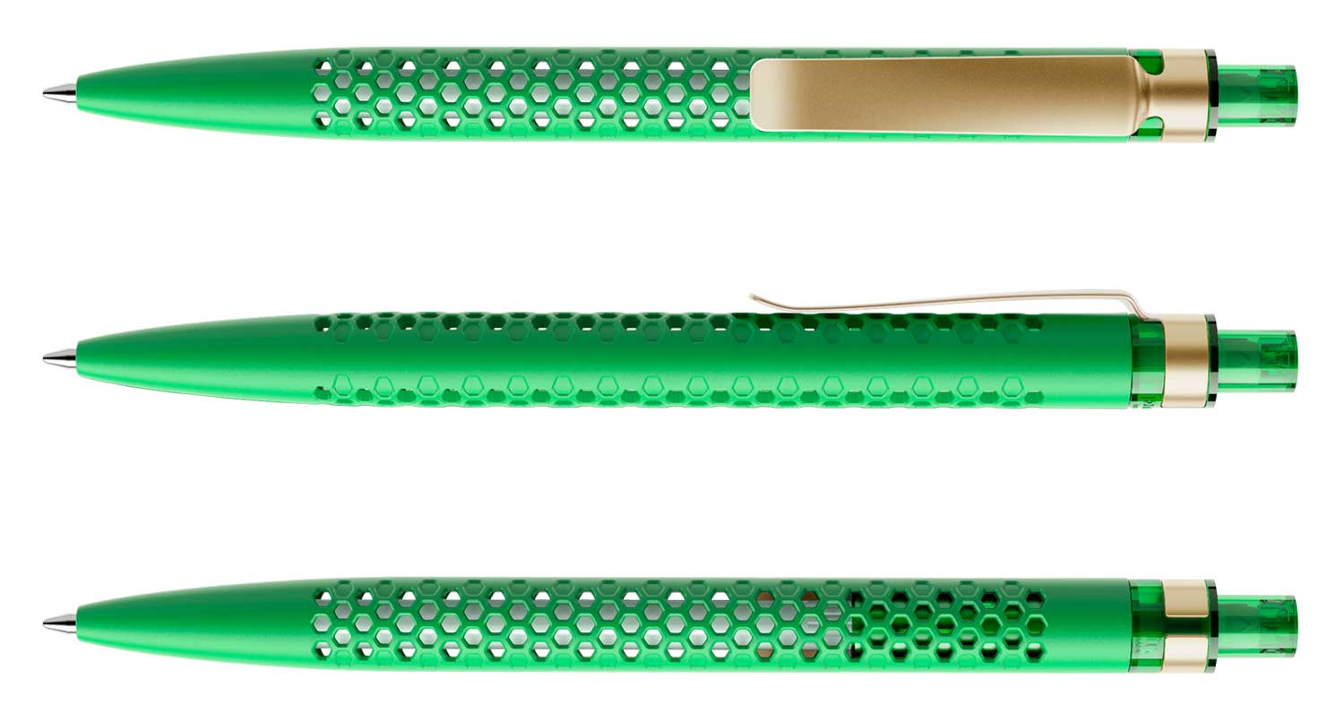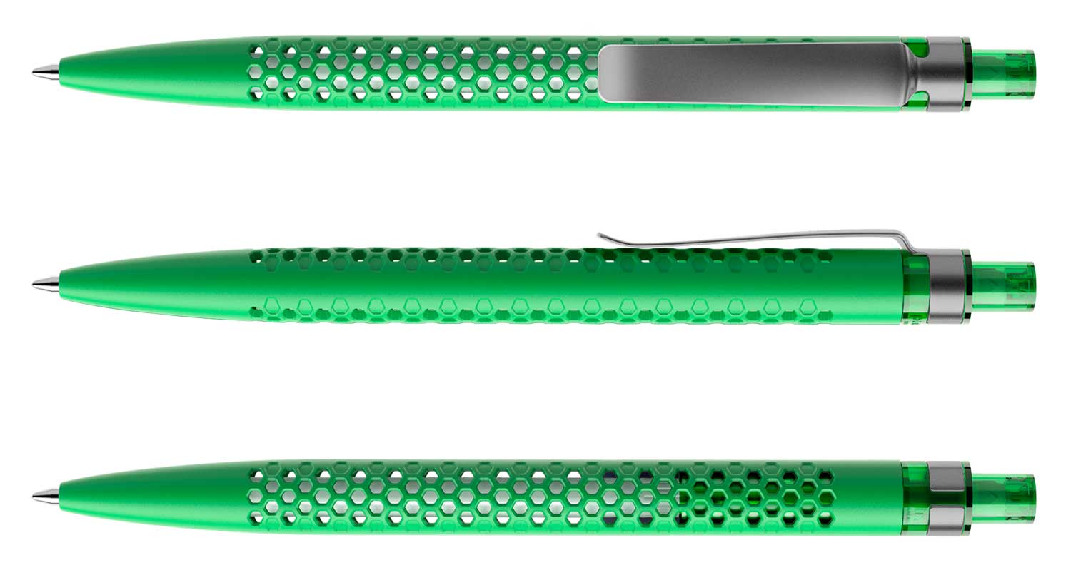 Das symmetrische Lochmuster schafft Transparenz, und die Mine im Innern des Schreibgeräts ist sichtbar. Dadurch gewinnt das Gehäuse eine dreidimensionale Tiefe. Die Minen, in Weiss, Schwarz oder Metall, werden Teil der Aussenwahrnehmung, setzen feine Akzente.